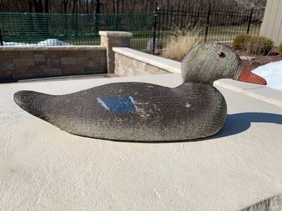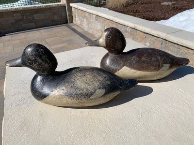 Very nice and all original pair of tack eye blue bills. The bodies are the same size as the standard grade glass eye decoys. These are a rig mate pair of decoys. The drake is in excellent all original paint. There is very little wear to the paint. The hen is also in excellent all original paint. There is very little wear to the paint. Both decoys are initialed FC or FG on the bottom. (Item 1100/1101) Asking Price: SOLD