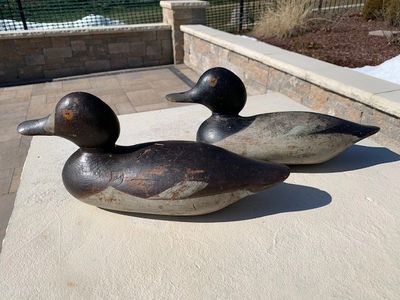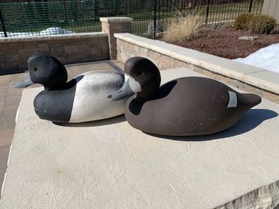 All original and unique pair of bluebill decoys. All wood bodies and heads, with glass eyes. Leather anchor strap with lead pad weight. Some minor scrapes and bumps, but otherwise great. Both decoys are signed Barnegat Bay Decoys, Point Pleasant, New Jersey, Circa 1980. They are also both signed by Art Birdsall, Captain Chip Allsopp, and Frederick Brown. Decoy is stamped GUTWEIN. Circa 1980. (Item 413/414) Asking Price: $325.00/pair