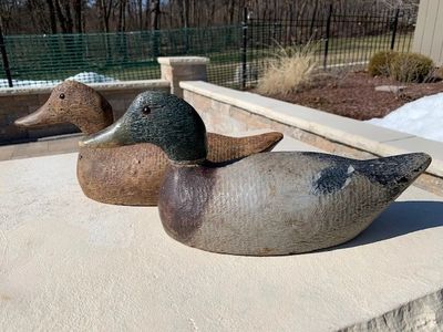 Competitive grade mallard pair in original condition and paint. They appear to be rig mates. The bodies retain the original lathe marks with rough heads. The drake has a minor chip out on the right side of the breast. Drake has a tight crack in the bottom from when the decoy was made. Previously weighted and barely hunted over. The hen is in equally excellent condition. Small hole in the front left breast area and a few shot marks on the right side. Chip to the top of the tail that is barely noticeable. (Item 1095/1096) Asking Price: SOLD