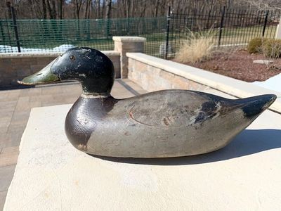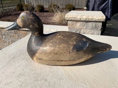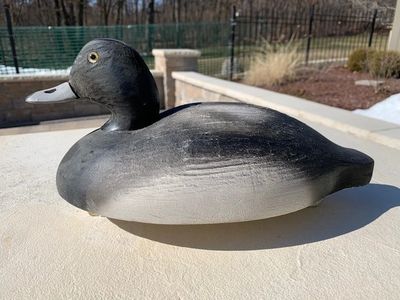 Later grade mammoth bluebill hen in all original condition and paint. Very minor wear from use. The decoy has a very tight crack on the right top. There is a factory crack on the left side (pictured) with joint fastener nails in the front and back and original filler. This is a testament to Walter being frugal and never wasting a decoy. Stamped EVANS DECOY on the bottom and has the original weight from breast to tail. (Item 1126) Asking Price: SOLD