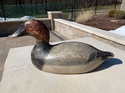 Mammoth canvasback drake in all original paint. Has average wear from use across the entire body. Has a more rounded head. Both speculum have a small amount of missing paint. Both glass eyes are intact with no cracks. Branded on the bottom F.W and painted brand of F.B.W. (Item 1025) Asking Price: $575.00