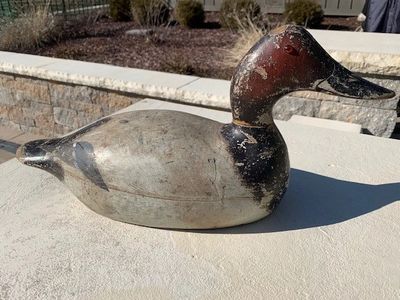 Later grade mammoth canvasback drake in all original paint. There is hunter wear to the decoy which adds character. There is a tight crack to the right hand side (pictured) which has a joint fastener nail on the front and back side. Minor wear across all of the body but still a very strong decoy. The bottom retains the original weight from breast to tail and has an original Evans stamp. (Item 1127) Asking Price: SOLD