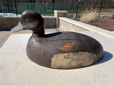 Very early bluebill hen decoy in all original paint. This is a Michigan "Bobtail" style decoy. The keel has been removed and there is a crack across the left hand side of the top as can be seen in the photo. Very nice head style and detailed carving. The bottom is signed in pencil "Albright, 1929". Very nice vintage decoy from 1929! (Item 1093) Asking Price: $165.00