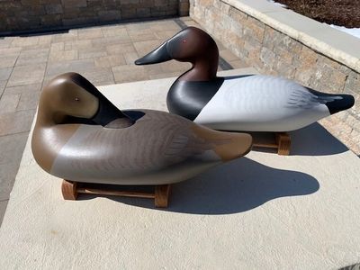 Canvasback decoy pair in mint/original condition and paint. Drake has a straight head while the hen is a sleeper. Great feather detail and painted eyes in the typical Bryan fashion. Both are signed and dated "Charles Bryan, Middle river, MD '04". Mint in all respects. (Item 550/551) Asking Price: $425.00/pair
