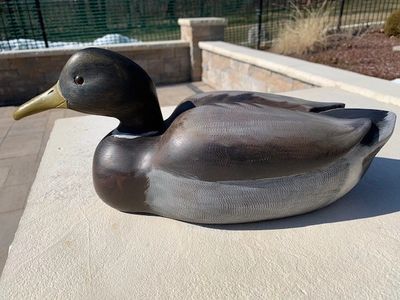 Mallard drake, mint original condition and paint. This decoy was carved by Hartmann in 1942 and painted by Malcolm Clark. There is a document attached to the bottom of the decoy explaining this joint effort. Fine detail carving, stamped Hartmann Decoy Company. Dated 1942 and statement signed by Hartmann. Small crack in neck. (Item 265) Asking Price: SOLD