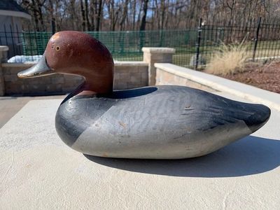 Redhead drake decoy in strong original condition and paint. This is a pre 1950 decoy since the U nail for the anchor line was vertical (front to back). This technique was later changed to horizontal since the vertical position would split the decoy. Some small dents and scratches, but overall in very good condition. Some detail carving around the bill. Weight and loop for anchor string have both been removed. Not signed. Labeled on the bottom HTO. (Item 915) Asking Price: SOLD
