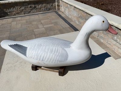 Snow goose in original condition and paint. This is a solid body decoy. Overall condition is excellent with some very minor discoloration around the head and neck and a small scuff on the right hand side. Retains the original weight and anchor line loop. Painted eyes as typical with Madison Mitchell. Signed in electro pen and dated 1983. (Item 0250) Asking Price: SOLD