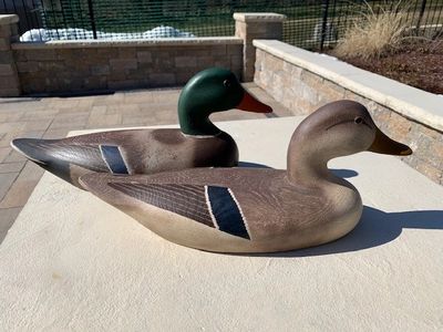 Very nice pair of Ora Clough mallard decoys. These are labeled that they have been made by Ora Clough, but repainted by Jupe Houman (Hudson, Wisconsin) who was an avid collector of these decoys. Outstanding original paint in the Clough style. Both have glass eyes. Both are labeled on the bottom. (Item 1059/1060) Asking Price: SOLD