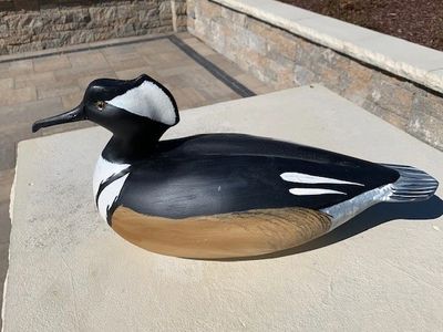 Outstanding merganser drake in mint original condition and paint. The decoy is hollow and retains the original keel weight. Head is turned slightly to the left. From the tip of the bill to the tail the decoy measures 16 inches. Both original glass eyes are intact. Outstanding original paint. Signed W. R. Goenne on the bottom. Circa 1993. (Item 0116) Asking Price: SOLD